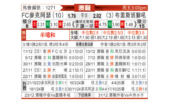 [澳超] 麦克阿瑟FCvs布里斯班狮吼