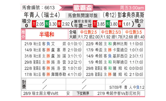 [欧联杯] 年青人vs帕纳辛纳科斯