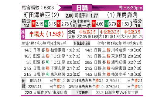 [日职联] 町田泽维亚vs鹿岛鹿角